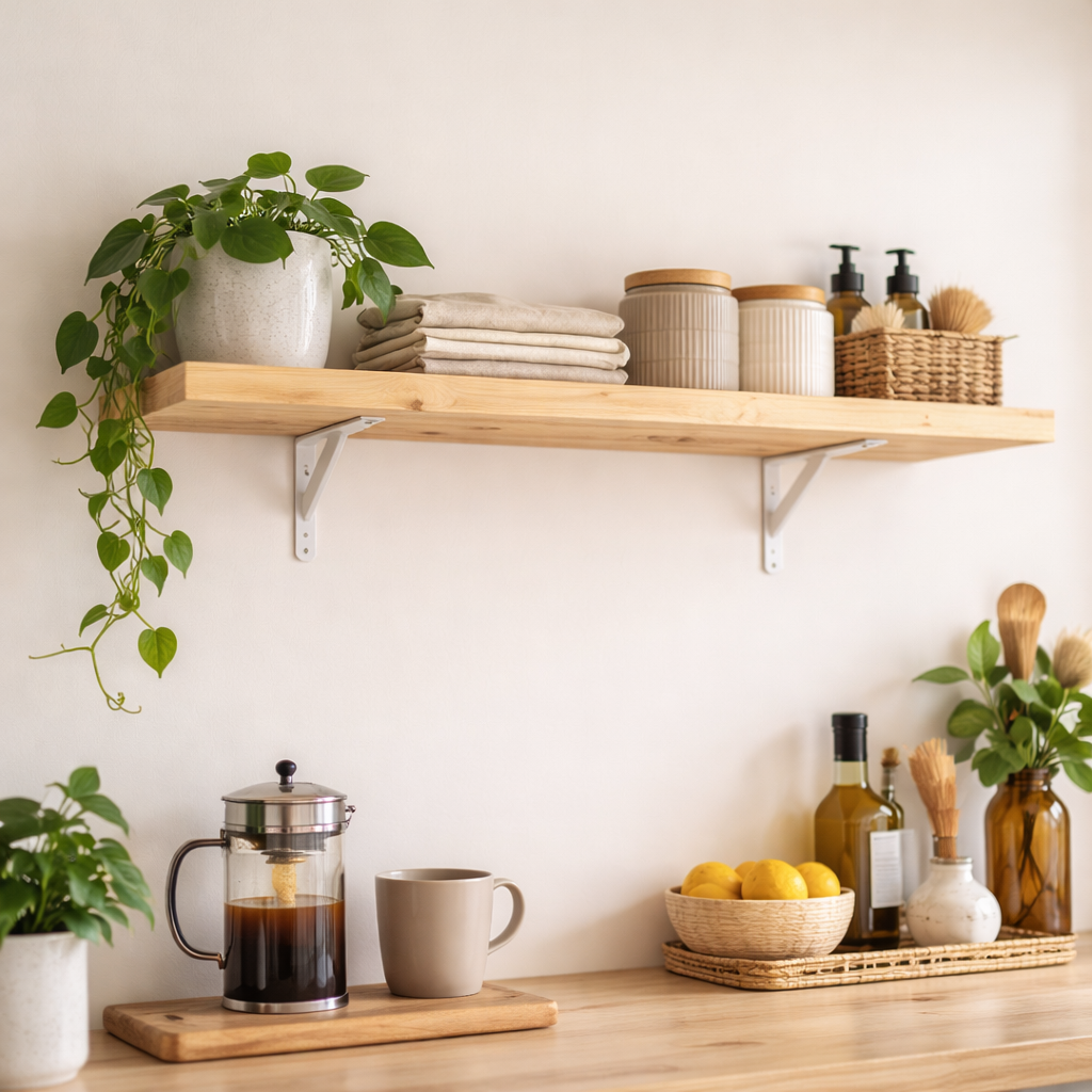 A Prateleira Pinus Natural é acompanhada por duas mãos francesas e oito parafusos (quatro para fixação na parede e quatro para a prateleira). Decore seu ambiente com leveza e sofisticação, utilizando sua criatividade para combinar elementos sem a inconveniência de mãos francesas visíveis. Além disso, desfrute da economia de espaço e da ausência de poluição visual.